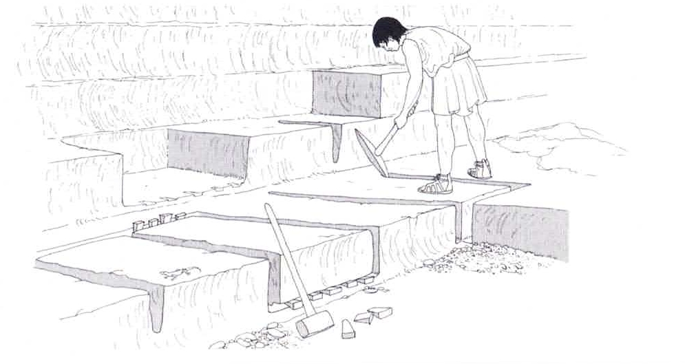 On distingue nettement les traces laissées par les outils des tailleurs de pierre